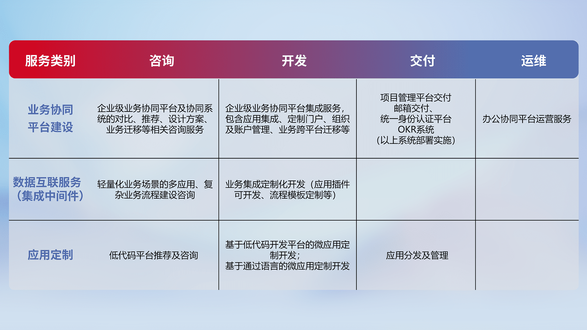 针对钉钉、、、、企微、、IDaas等平台级产品提供产品的规划、、方案、、、交付、、、、定制化开发等服务,,实现如统一协同办公、、、智能客户服务、、混合会议管理、、智能数据查询、、等业务场景,,实现数字化转型。。。