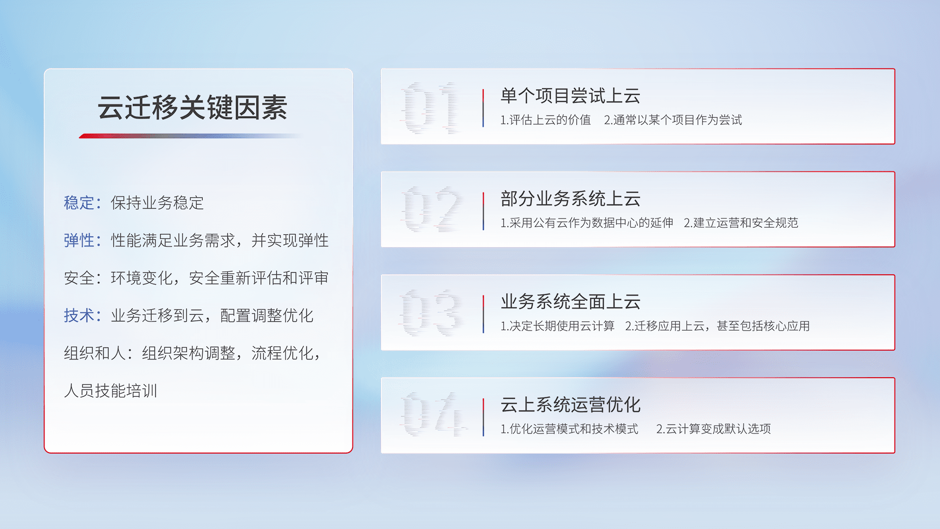 结合实际业务,,,从规划设计、、、、云平台选型、、、、云原生改造、、、、数据迁移、、、集成交付,,迁移全过程为客户识别最佳上云路径,,,,做好风险识别管理,,,,设计网络架构、、身份权限、、安全审计合规、、、、操作审计、、、日志审计、、监控告警策略、、多站点容灾设计等,,,,对云上基础设施进行整体规划,,,提升IT治理水平,,以满足弹性、、高可用、、、、高性能的需求。。。
