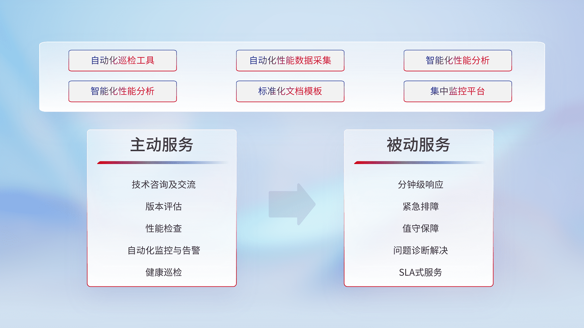 智能化工具和标准化文档,,,保障服务质量,,提供主动服务(包含技术咨询、、、、版本评估、、、、性能检查、、自动化监控与告警、、、、健康巡检)和被动服务包含(分钟级响应、、紧急排障、、值守保障、、、问题诊断解决、、、、SLA服务)。。。。